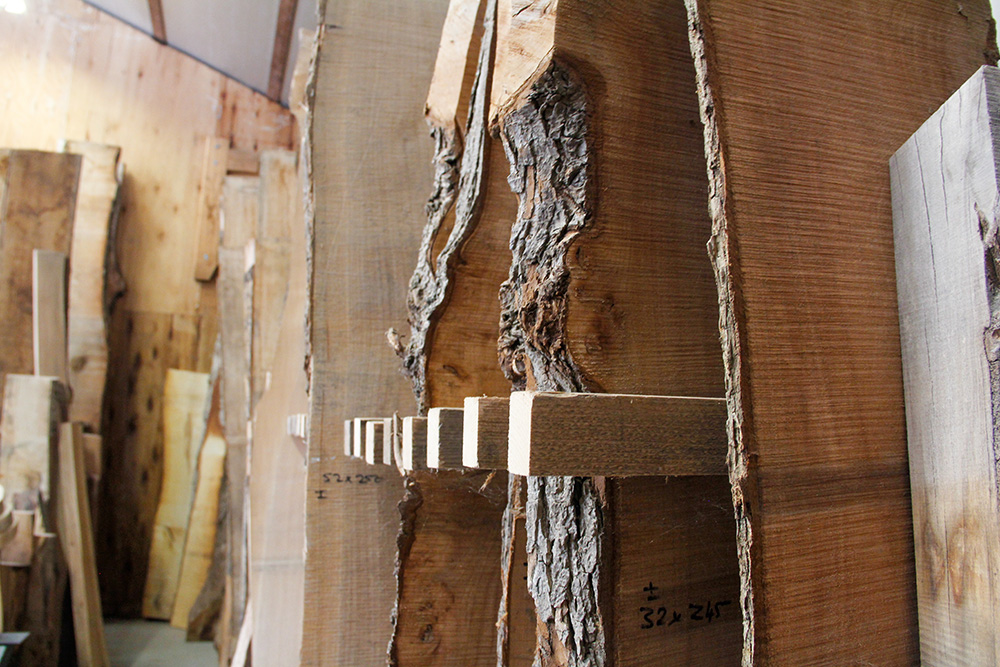 Alan snijdt daarmee een belangrijk onderdeel van zijn ambacht aan. “Neem bijvoorbeeld een Franse eik, die groeien meestal in het midden van bos, recht omhoog naar het licht. In onze omgeving zijn het vaak bosrandbomen of solitaire bomen die meegroeien met de stand van de zon, elke dag opnieuw. Als je die in planken hebt gezaagd en gaat drogen, krijg je diezelfde draai erin. Dus je verliest best wel veel materiaal om het weer recht te krijgen.”